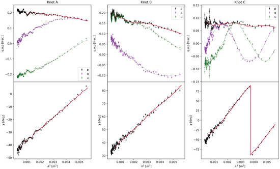 Depolarization modelling of the knots A, B and C. Polarized Stokes parameters q and u of the three knots have been fitted using three internal Faraday screens. Top panels: the magenta points are the Stokes q, the green points are the Stokes u and the black points are the fractional polarization p. Bottom panels: the black points are the polarized angle [deg]. Gray dot-dashed lines and red straight lines are the resulted model fit.