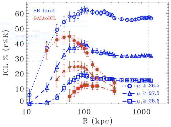 Despite the common use of this method, it suffers from two non-negligible problems: (1) it does not account for the ICL that overlaps with the BCG in the transition between the two components; (2) the ICL is contaminated by the contribution of large galaxies in the cluster (see, e.g., []). Presotto et al. [] developed a method to obtain refined versions of typical BCG + ICL maps that can be obtained with simple surface brightness cuts. Their method focused mainly on the removal from the map of the light coming from satellite galaxies (the so-called masking). In Figure 2, a comparison is shown between the standard method of surface brightness cut (blue lines and symbols) and the results with their approach (red lines and symbols). They find that the standard surface brightness cut method systematically overpredicts the fraction of ICL as a function of distance from the center, independently of the particular cut used. It must be noted, however, that there are observational studies (e.g., [] for the Abell 85 cluster) that found the opposite trend, i.e., the surface brightness cut method gives a lower fraction of ICL than, e.g., the profile fitting method. Figure 2 shows also that a standard surface brightness cut has a steep increase from the core to around 100 kpc (in the particular case of MACS J1206.2-0847, which is a massive galaxy cluster at and part of the CLASH sample []) followed by a plateau. On the other hand, Presotto et al.’s masking causes the ICL contribution to drop at large radii, suggesting that most of the ICL is concentrated close to the BCG, which is in good agreement with several recent observational and theoretical results (e.g., [,,,]).
