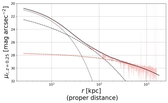 The BCG + ICL light profile from Zhang et al. [] resulted from the stacking of around 300 clusters at redshift . The authors found that it can be approximated with three Sersic components (black solid line): a core (dotted line), a bulge (dashed line) and diffuse (red dashed line) components. See text for further details. Credit: Zhang et al. [].