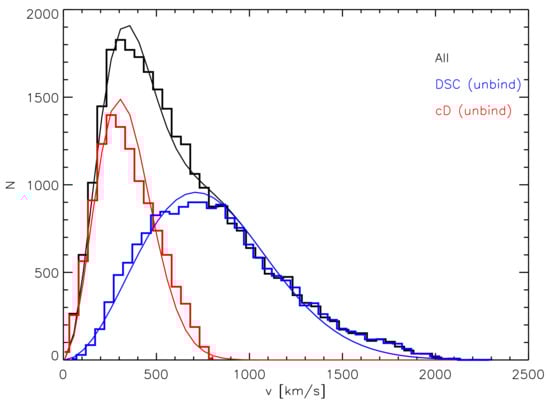 However, despite the binding energy method being efficient in finding stars not bound to satellite galaxies, it does not succeed in separating the BCG from the ICL. Indeed, given the fact that the BCG is placed at the center of the cluster potential, it is not possible to distinguish its mass density profile from that of the cluster itself. In order to completely separate the two components, a few accompanying solutions have been suggested. The most common one has been introduced for the first time by Dolag et al. [], who used the kinematics of the two components to separate the BCG from the ICL. They found that it is possible to fit the velocity distribution of BCG + ICL with two Maxwellians having different velocity dispersions, and suggested that they correspond to the two components. Figure 4 from Dolag et al. [] shows the result of their fit: The total velocity distribution of BCG + ICL is marked with a black histogram and its double Maxwellian fit with a grey line. The red and the blue histograms show, instead, the velocity distributions of the BCG and ICL stars, and the corresponding red and blue lines are the two separated Maxwelllians.