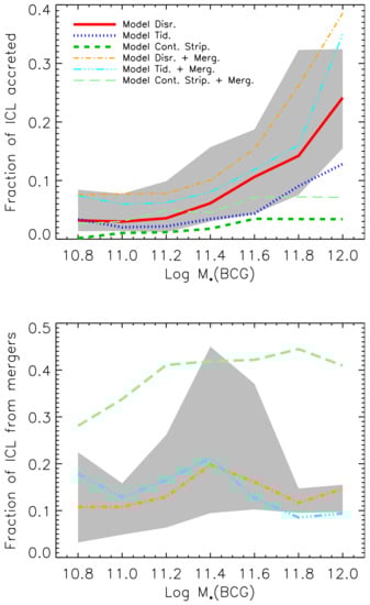 Top panel: fraction of ICL that has been accreted as a function of the mass of the BCG for different flavors of the model described by Contini et al. []. Bottom panel: fraction of the ICL coming from the merger channel as a function of BCG stellar mass. Credit: Contini et al. [].