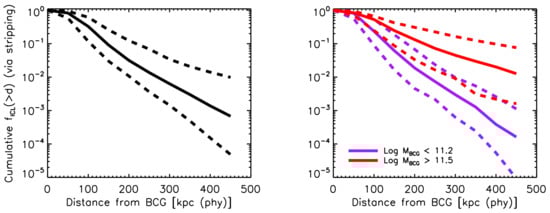 A clear example of the efficiency of stellar stripping in the innermost regions of groups and clusters is given in Figure 6 (from Contini et al. []). The left panel shows the cumulative fraction of mass in ICL that has been produced by stellar stripping as a function of distance from the BCG. The solid black line, which represents the median of the distribution, shows that only 10% of the total ICL coming from stellar stripping is built-up at distances farther than 150 kpc, which means that almost all the ICL produced via this channel actually comes from stripping events that happened in the innermost 150 kpc. The right panel of Figure 6 shows the same information shown in the left panel but for two samples of BCGs: less massive than (purple lines), and more massive than (red lines). The panel clearly shows that for more massive BCGs, most of the ICL coming from stellar stripping tends to be produced at larger distances than for less massive BCGs. This result is explained by the trend discussed above, i.e., less massive BCGs are likely to reside in less massive haloes, and these objects are more centrally concentrated than their more massive counterparts.