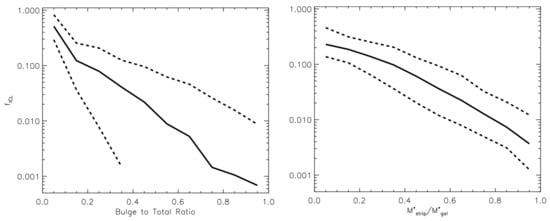 Stellar stripping is stronger in the innermost region of the haloes, and massive satellites (due to dynamical friction) reach that region faster. It is, then, reasonable to expect that they are the most important contributors to the ICL. This prediction was made in Contini et al. [], and later confirmed by several observations (e.g., [,,,,]). In Contini et al. [], they also looked at what kinds of galaxies contribute the most to the production of ICL via stellar stripping. Figure 7 (from Contini et al. []) shows the amount of ICL produced in the innermost 100 kpc via stellar stripping, as a function of the bulge-to-total ratio (left panel), and the amount of mass stripped over the mass of the satellite at the moment of stripping (right panel), for satellite galaxies involved in stripping events. The trend appears pretty clear: disk-like galaxies (B/T < 0.4) contribute the most to the production of ICL, while ellipticals and spheroidals contribute in a marginal way (for details see []). The message shown in the right panel is as interesting as the previous one. Indeed, most of the ICL produced by stellar stripping in the innermost 100 kpc comes from small/intermediate stripping events that cut just <30% of the mass of the satellite at the moment of stripping. The total disruption of the satellite is a very unlikely event.
