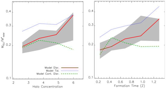 The scatter in the relation can be explained, mostly, in terms of the concentration and formation time of the particular halo in which the ICL formed. Figure 8, taken from Contini et al. [] (set of implementations of the ICL in a semi-analytic model), shows that depends on both concentration and halo formation time and increases for more concentrated and old haloes (except for a model for which the reader can find the details in Contini et al. []), which is a direct consequence of the dynamical evolutionary state of the haloes. In more concentrated haloes, the tidal forces are stronger and the probability of stellar stripping increases. Similarly, older haloes have more time to produce ICL or acquire it from smaller haloes. The concentration and the halo formation time can explain the large scatter that is observed in the relation for high mass haloes, but, once we plot the same information for smaller haloes, on group scale, the correlation disappears. In Contini et al. [], the authors argued, and proved, that in this low halo mass regime, the scatter in the relation is driven by the number of intermediate/massive satellites which, as argued above, are those that contribute the most to the production of the ICL (I will come back to this topic in Section 4.2). The scatter in the accretion of intermediate/massive satellites drives the scatter in the relation in a way that the larger the number of intermediate/massive satellites accreted, the higher the fraction of ICL. It must be noted, however, that the above explanation concerns the scatter in the relation predicted by theoretical models, and the same exercise can be performed in hydrosimulations, but the observed scatter might depend also on other factors, such as sample selection and data quality, as well as the definitions used by different authors to separate the ICL from the rest.