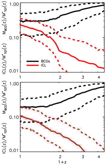 However, nowadays, a scenario is commonly accepted where the BCG and the ICL co-evolve (to which I will come back to in Section 4.3), for which the period after and the present day is the time for a rapid growth of the ICL but of a slow and little growth of the BCG. This is supported by several numerical models/simulations but also by observational evidence (e.g., [,,,,]). In order to give an idea of what numerical models predict in the redshift range for the growth of the BCG and ICL, Figure 9 shows how the ICL/BCG fractions grow with time after , for the reference model in Contini et al. [] (top panel) and described in Section 2.2, and a model where the ICL forms only through mergers, with the mass of the satellite that is equally split between BCG and ICL during each merger (bottom panel). Both panels show an interesting trend: while the BCG grows slower than the overall growth of the stellar mass in the cluster (decreasing fraction), the ICL grows faster (increasing fraction). As mentioned above, these behaviors of BCGs and ICL have important consequences on the whole evolution of BCG-ICL systems, and they are strictly linked to the growth of clusters. I will fully address this point in Section 4.3.
