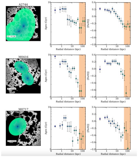 A few examples of age and metallicity gradients for three clusters of the Hubble Frontiers field survey in the range . The clear tendency for the stellar populations in these BCG + ICL systems is to become younger and more metal-poor with increasing distance from the center, i.e., in the regions dominated by the ICL. Metallicity and age are derived via stellar population synthesis models (see the original paper for the details of the modeling). Credit: Montes; Trujillo [].