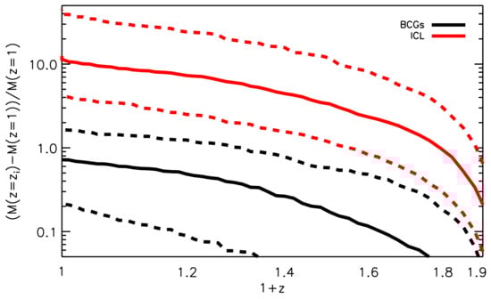 Residual mass of the ICL (red lines) and BCGs (black lines) normalized by the mass at redshift . Solid and dashed lines represent the median, 16th and 84th percentiles of the distributions, respectively. Credit: Contini et al. [].