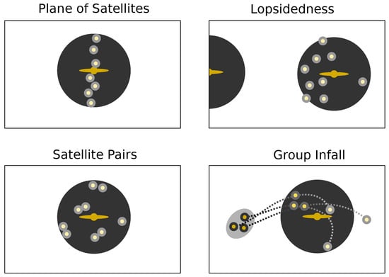 Schematic representations of different types of phase-space correlations that have been studied among systems of satellite galaxies. Clockwise starting from the top left: Planes of satellite galaxies (Section 2.2), lopsided satellite galaxy systems (Section 2.4), the infall of satellites in groups (Section 2.3), and close pairs of satellite galaxies (Section 3.1).