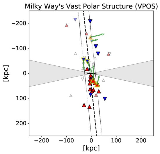 It was already noticed 45 years ago [,] that the then-known MW satellites, some distant globular clusters, and the Magellanic Stream lie along a common great-circle. Over the last few years, supported by the discovery of additional satellite galaxies, this suspicion was corroborated (see Figure 2). It was shown that the Milky Way is surrounded by a Vast Polar Structure (VPOS), a rotating plane of satellite galaxies, which also contains several globular clusters and stellar and gaseous streams [], though the preferential alignment of streams has been questioned with an expanded sample []. The VPOS has a root-mean-square (rms) height of only 20–30 kpc, but a radius of 250 kpc. As fainter satellite galaxies around the MW were discovered, they were also found to align with the VPOS [,]. A major concern was that since many discoveries were made by SDSS, the survey’s footprint might cause the alignment with the VPOS. However, a statistical analysis that carefully reproduced the survey’s sky coverage showed this worry to be unsubstantiated: the SDSS satellites do add significance to the structure (raising it from to ) [].