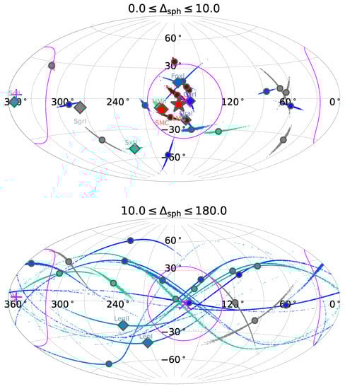 - Shao, S.; Cautun, M.; Frenk, C.S.; Grand, R.J.J.; Gómez, F.A.; Marinacci, F.; Simpson, C.M. The multiplicity and anisotropy of galactic satellite accretion. Mon. Not. R. Astron. Soc. 2018, 476, 1796–1810. [Google Scholar] [CrossRef]