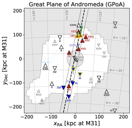 A similar satellite plane, the Great Plane of Andromeda (GPoA), was then discovered around M31 (see Figure 4). It consists of 15 out of 27 satellites within the PAndAS footprint, with an rms height of 12.6 kpc, and is seen edge-on from the MW [,]. The line-of-sight velocities of 13 of the satellites indicate that they have the same orbital sense around M31, such that the GPoA appears to be co-rotating, too. However, structures with correlated line-of-sight velocities in simulated satellite systems are not necessarily kinematically coherent structures, but they can also be transitory features, as often found in cosmological simulations [,]. In this regard, it is intriguing that the first HST proper motion measurements for the two M31 satellites, NGC 147 and NGC 185, which are part of the GPoA, demonstrate that these two objects are indeed likely orbiting along the satellite plane []. This finding strongly supports the possibility that the GPoA is a coherent structure akin to the VPOS, but it will need additional proper motion measurements to fully assess the orbital alignment of the on-plane satellites. The dynamical stability of satellite planes similar to the GPoA was tested by Fernando et al. [,], who found a strong dependency on the orientation and shape of the underlying potential (e.g., more spherical halo shapes are beneficial for long-term survival).