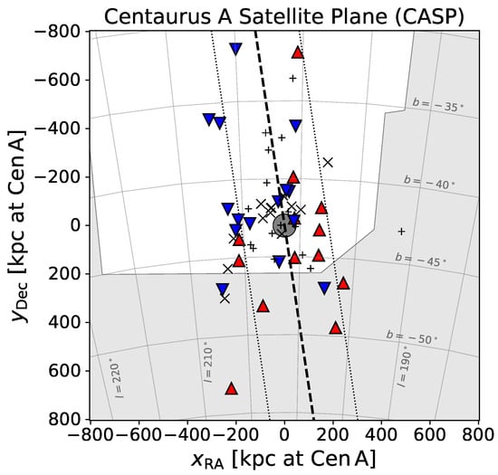 Distribution of dwarf galaxies around Centaurus A (dark grey circle in the center) as seen from the Milky Way, plotted similarly to Figure 2 and Figure 4. Dwarf galaxies with known line-of-sight velocities are colored, and other dwarf galaxies with consistent distance measurements (large crosses) or satellite galaxy candidates (black plus signs) are also shown. The dashed line indicates the major axis of the on-sky satellite distribution, and the dotted lines show its root mean square height.
