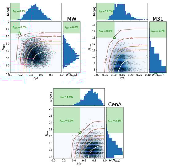 Comparison of flattening (horizontal axes) and kinematic coherence (vertical axes) of observed (green stars) satellite galaxy systems and those found around hosts of similar mass in cosmological simulations. For the Milky Way (top-left panel), flattening is measured as the minor-to-major axis ratio of the 11 brightest (classical) satellites, while the kinematic coherence is measured using the spherical standard distance of the seven most-clustered orbital poles . The data are based on the analysis presented in Pawlowski and Kroupa [], who report overall results to be very similar for other numbers of combined orbital poles, too. For Andromeda/M31 (top-right panel), the minor-to-major axis ratio flattening of the 15 most-flattened out of 27 satellites within a mock PAndAS footprint is compared with the number of satellites showing a coherent trend in the sign of their line-of-sight velocities relative to the host, as presented in Pawlowski & Sohn [submitted]. For Centaurus A (bottom panel), only the on-sky minor-to-major axis ratio is used to determine the flattening of the observed system (to ensure independence of the more considerable distance uncertainties), while the kinematic coherence is quantified as in the case of Andromeda, with the number of satellites following a coherent line-of-sight velocity trend. This comparison is based on the analysis presented in Müller et al. []. All three comparisons are based on the same cosmological simulation, the highest-resolution, hydrodynamical Illustris TNG-100 run []. The blue shaded region indicates the density of individual satellite system realizations in the simulated analogs (grey crosses). The red contours indicate the fraction of systems lying to the top left of each point, i.e., the systems that are more flattened and more coherent in their velocities. The green-shaded areas delineate the regions where systems would be as or more extreme than the observed ones, and the fractions f indicate how many simulated systems fulfil these criteria. Clearly, none to only a few simulated systems are simultaneously as flattened and as kinematically coherent as the observed satellite planes. Only of order 0.1% of the simulated systems reproduce these two quantities of the observed satellite galaxy planes.