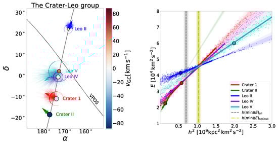 The proposed Crater–Leo group of MW satellite galaxies. The (left-hand panel) plots the on-sky positions of the five proposed group members in equatorial coordinates. They align along one great circle (solid grey line), which is inclined relative to the VPOS (dashed line). All satellites have relatively small galactocentric velocities (color coding of symbols). Smaller symbols correspond to more distant satellites, highlighting the smooth distance gradient among the members from the ∼110 kpc distant Crater II in the South to Leo II at ∼210 kpc in the North. The thick arrows indicate the most likely direction of motion based on current proper motion estimates; the thinner arrows indicate Monte Carlo samplings from the proper motion uncertainties, and the circle segments indicate the 1, 2, and 3 uncertainties in the velocity directions of the satellites. The velocities are currently not sufficiently constrained to clearly judge a possible association. All but Crater II are currently consistent with moving along the direction defined by the proposed group, but all could also could also move along the VPOS similarly to Crater II. The (right-hand panel) plots the specific total energy E and square of the specific angular momentum h for the five proposed objects, assuming an MW potential containing a mass of within 250 kpc. It is expected that satellites accreted as one group share similar energy and angular momentum. Within the current proper motion uncertainties (small dots indicate individual Monte Carlo sampled realizations of the observed data), Crater 1, Leo II, Leo IV, and Leo V share very similar energy and angular momentum (the point of closest crossing of all four is indicated by the vertical yellow band). Crater II appears to be unassociated due to its much smaller energy and angular momentum.