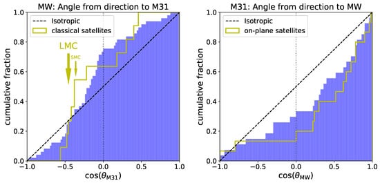 Cumulative distribution of the cosine of the angle between the position of satellites around the MW (left-hand panel) and M31 (right-hand panel), and, respectively, the direction from the MW to M31, and from M31 to the MW. The dashed black line indicates the expectation for an isotropic distribution. The dotted vertical line separates the hemispheres facing away from (left half, ) or towards (right half, ) the other major galaxy. The yellow lines give the cumulative distribution for only the 11 classical satellites of the MW, and for only the on-plane satellites of M31, respectively. For M31, there is a clear lopsidedness towards the MW, which is even more pronounced for the satellites that are members of its satellite plane. The MW satellites tend to preferentially face away from M31 (i.e., globally in the same direction as the M31 satellites), but uneven survey coverage areas and the presence of the LMC (corresponding angle indicated with a yellow arrow) with an entourage of its own satellites make this difficult to interpret.