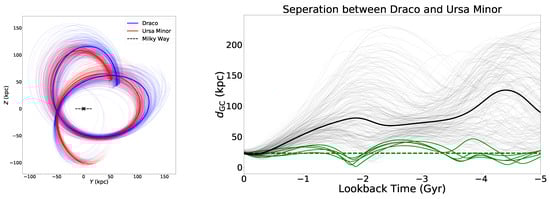 Possible orbits of the dSphs Draco and Ursa Minor, a proposed pair of MW satellite galaxies. The (left-hand panel) shows the orbits in the y–z plane of a galactocentric Cartesian coordinate system. This orientation is an almost face-on view of the orbital planes of both dwarfs (and the VPOS). Each line corresponds to one possible orbit realized by drawing from the observational uncertainties (most notably the distance and proper motion) in a Monte Carlo fashion. Draco and Ursa Minor are consistent as they share the same orbital plane, orbital direction, orbital eccentricity, and similar apo- and pericenters. The (right-hand panel) shows the separation between Draco and Ursa Minor resulting from different Monte Carlo realizations, integrated backwards for 5 Gyr. While the proper motion uncertainties remain too high to conclusively confirm that the two satellites share a similar orbit, they are consistent with co-orbiting close to each other, because numerous realizations result in an average mutual separation below 30 kpc (highlighted in green). The orbits were integrated using the galpy package, adopting its MWpotential14 with a dark halo mass of as the potential of the MW [].