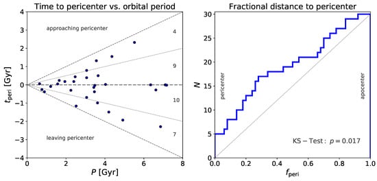Phase along their orbits of the observed MW satellites with apocenters within 300 kpc, adopting the orbital parameters for the lower-mass MW model from Battaglia et al. []. The (left-hand panel) plots P, the period of the satellite’s orbit, against , the time to the next pericenter (if positive) or the time since the last pericenter passage (if negative). The thin dashed lines indicate the possible limits (i.e., satellites at apocenter), and the thick dashed line indicates where satellites are at their pericenter. The dotted lines split these regions in half, which, for satellites in random phases, should be populated equally. However, the observed satellites (blue points) lie preferentially closer to their peri- than their apocenters, as indicated by the counts on the right. The (right-hand panel) shows the cumulative distribution of , the fractional position in time of the satellite between the pericenter () and apocenter (). For satellites at random phase, the latter should result in a uniform distribution (dashed line in right-hand panel), yet the observed satellites appear to be preferentially found close to their pericenters. A Kolmogorov–Smirnov test provides a probability of only 1.7% that the observed distribution was drawn from this expectation.