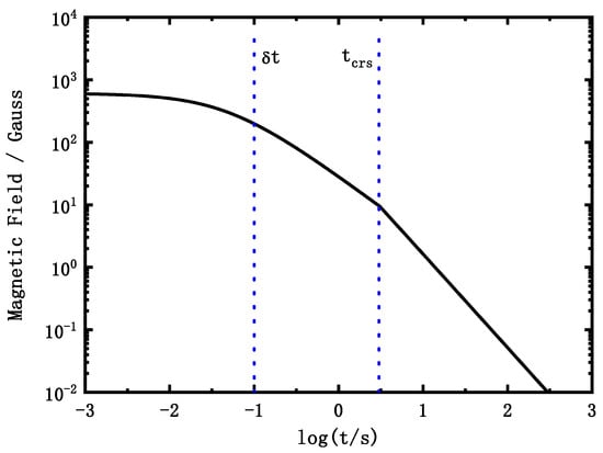 The magnetic field as a function of time. The two blue vertical dotted line represents the redefined interval and the shock crossing time , respectively. After the shock crossing time, the merged shell expands adiabatically and is assumed. The dynamics parameters , , , , , , and are taken from numerical calculations.