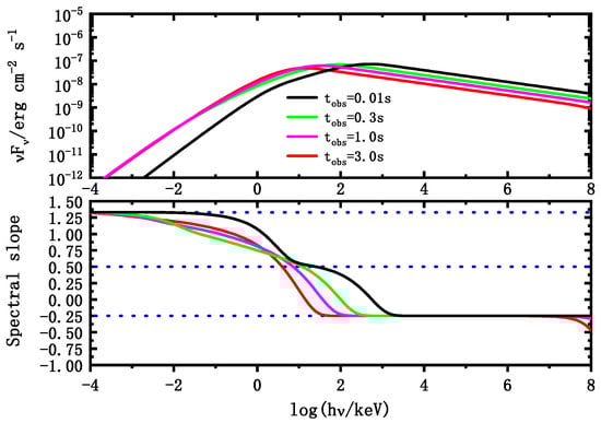 From Figure 3, we can see that for , because of a constant magnetic field, the spectral slope of is as described by []. However, when , the spectral slope will deviate from and become a larger value (even ). If the electron index () is u, the slope of synchrotron radiation () would be and the photon spectral index (defined as , where is the photon energy, and is the photon number flux) would be . Due to the decaying magnetic field, u tends to be zero, and thus and . However, when , because of the overlying effect, the low energy photon index of the electrons with is and will cover the emission of electrons with smaller Lorentz factors. So, due to the effect of the low-energy radiation tail of electrons with Lorentz factor , is at most equal to , and we can get . This is consistent with the observations [,], which suggest .