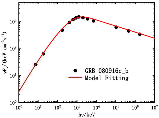 The time-averaged spectrum to fit the interval “b” of GRB 080916c. The black points are selected from the Band function with the low-energy photon index , the high-energy photon index and the peak energy provided in Ref. [], which are precise enough to present the tendency of the actual GRB emission. This spectral duration is from to and we fit it by adopting the time-averaged spectrum from to (). The fitting parameters are listed in Table 1.