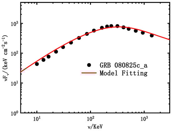 The time-averaged spectrum to fit the interval “a” of GRB 080825c. The black points are selected from the Band function with the low-energy photon index , the high-energy photon index and the peak energy provided in Ref. [], which are precise enough to present the tendency of the actual GRB emission. This spectral duration is from to and we fit it by adopting the time-averaged spectrum from to (). The fitting parameters are listed in Table 1.