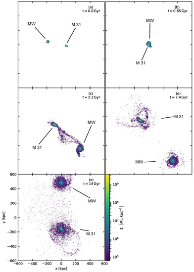 The simulation was performed with the spatial resolution of 120 pc. There were initially particles in the simulated Milky Way and particles in the simulated Andromeda galaxy. There were only stellar particles in the simulation, no gas. Other galaxies in the Local Group were not included in the simulation. The masses and effective radii of the pre-encounter galaxies were set to be as observed. The inclinations of the disks of the galaxies with respect to the orbital plane of the galaxies were set as observed too. Once the simulation finished, we verified that the encounter did not change the parameters of the galaxies substantially. The initial orbital conditions of the encounter were found iteratively. We launched the simulations until we reproduced the observed distance of the galaxies and their radial and transversal velocity. We adopted the observed relative velocity of the galaxies from the measurements by the Hubble Space Telescope [90]. The used value was lower but still marginally consistent with the value given by the latest measurements by Reference [91]. In contrast to the analytic model of [42], our simulation neglected the external field effect arising from the large-scale cosmic structure and the repulsive force between the galaxies caused by cosmic expansion. The evolution of the simulated interaction is depicted in Figure 1.