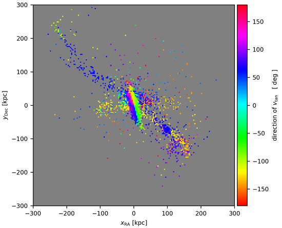 At the moment in the simulation that corresponds to the current time (Figure 1d), there was a disk of material around Andromeda. It originated from the tidal arm that was ejected from the Milky Way and was captured by Andromeda. It displayed many characteristics of the observed disk of satellites of Andromeda. It had approximately the correct diameter and pointed on the simulated Milky Way with its edge (Figure 2). When viewed from the position of the Sun in the simulation, it showed a smooth gradient of line-of-sight velocity, giving the impression of ordered rotation. It should be mentioned that the structure formed a thin disk only temporarily. There were even hints of tidal dwarf galaxies in this structure. However, our simulation was probably not suitable for investigating the formation of tidal dwarfs: it was found with Newtonian gravity [92] that, if tidal dwarf galaxies form in simulations without gas, then the dwarfs are actually only numerical artifacts that disappear once the simulation has a sufficient mass resolution. Nevertheless, tidal dwarf galaxies in MOND simulations with gas generally form very easily [44,47,93] and, therefore, it is credible that once our simulation is repeated with gas there will appear true tidal dwarf galaxies arranged in a disk of satellites. Further satellites in the disk could be descendants of the self-bound giant gas clumps that are observed in high-redshift galaxies, e.g., [94,95,96]. Their stellar masses at the relevant redshift reach the values of [97], commensurable with the Magellanic Clouds.