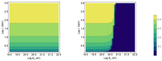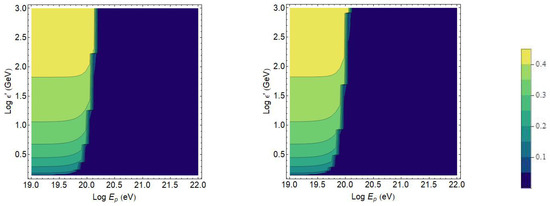 The comprehension of UHECR physics must be improved in order to conduct the anisotropy analysis that underlies all the potential QG studies in the CR propagation sector. Indeed, this analysis can be spoiled by the presence of Galactic (GMF) and Extragalactic Magnetic Fields (EGMF). Since CR are charged particles, their trajectories are affected by magnetic fields and the measure of the deflection can be obtained evaluating the particle rigidity, that is the ratio of CR energy and charge: , for higher rigidity values the resulting deflections are smaller: , where is the average deflection angle. The theoretical and experimental uncertainties about EBL, GMF [10,11] and particularly EGMF can spoil this analysis. Posing constraints on the magnitude of EGMF, for instance, is extremely complicated since the universe is mostly composed of cosmic void, therefore the EGMF magnitude evaluation ranges from ∼×10 G [12] to ∼×10 G [13]. Most of the studies about EGMF effects on UHECR propagation are conducted by simulating the cosmological structure formation, but with conflicting and inconclusive results [14,15]. A last remark about the necessity of better understanding the nature of the primary CR in order to discriminate the lighter UHECR component from the heavier one on a particle-by-particle basis. Recent studies of the Pierre Auger collaboration indicate that above the energy threshold of ∼×10 eV the CR flux is dominated by the light primaries, nevertheless as the energy increases the lightest fraction (protons) seems to be partially replaced by an intermediate mass component (He-N) with a Fe contribution above ∼×10 eV [16,17].