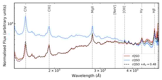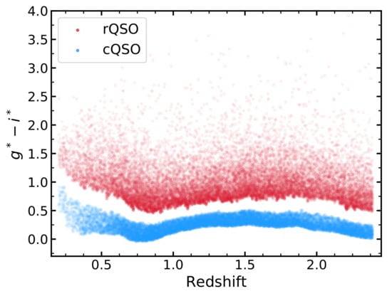 - Richards, G.T.; Hall, P.B.; Vand en Berk, D.E.; Strauss, M.A.; Schneider, D.P.; Weinstein, M.A.; Reichard, T.A.; York, D.G.; Knapp, G.R.; Fan, X.; et al. Red and Reddened Quasars in the Sloan Digital Sky Survey. Astron. J. 2003, 126, 1131–1147. [Google Scholar] [CrossRef]