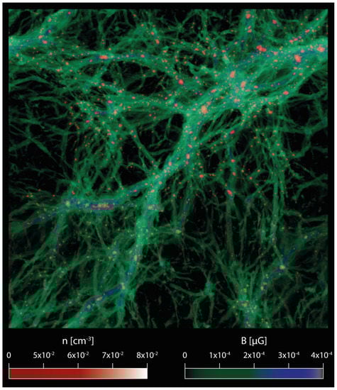 - Pakmor, R.; Marinacci, F.; Springel, V. Magnetic Fields in Cosmological Simulations of Disk Galaxies. ApJ Lett. 2014, 783, L20. [Google Scholar] [CrossRef]