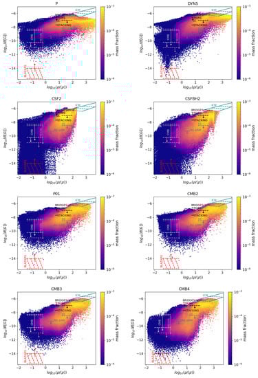 - Astrophysical sources of magnetisation: in runs including radiative (equilibrium) cooling, gas undergoes collapse and can form stars, or supermassive black holes. We resorted here to the numerical recipes in the public version of ENZO [101] to further release of magnetic dipoles, with a total magnetic energy per event which is a fixed fraction of the feedback energy. The injection of additional magnetic energy via bipolar jets happens with an efficiency with respect to the feedback energy, the latter being times the energy accreted by star forming particles. Likewise, we use the prescriptions by ENZO [152] to inject and grow SMBH and attach magnetic feedback to their thermal feedback. We assume accretion for SMBH following from the spherical Bondi–Hoyle formula with a fixed accretion rate, and a fixed “boost” factor to the mass growth rate of SMBH () to balance the effect of coarse resolution, properly resolving the mass accretion rate onto our simulated SMBH particles. The injection of additional magnetic energy via bipolar jets happens with an efficiency and efficiency with respect to the thermal feedback energy, which is set to be . The only run presented here which features magnetisation by stars and supermassive black hole feedback is CSFBH2, which was shown to yield the most realistic results on the cosmic star formation history, as well as on scaling relations of galaxy clusters and groups in earlier work [65,104]. We also showed results from the CSF2 run, which only contains feedback from the star forming phase.