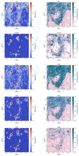 - CMB2, CMB3, and CMB4: we simulated primordial magnetic fields derived from the constraints by the Cosmic Microwave Background observations following our recent work [105]. In detail, the fields scale dependence is described by a power law spectrum: characterised by a constant spectral index and an amplitude, commonly referred by smoothing the fields within a scale , and therefore in the remainder of the paper we will use to refer to the smoothed magnetic field amplitude. In this work, we used the three models outlined in [105], which resulted as the least challenged by low-redshift radio observations of the cosmic web: we assumed (CMB2), (CMB3) and (CMB4) and , and (comoving), respectively. All runs also adopted the same run-time sub-grid model for dynamo amplification, as in the P01 model.