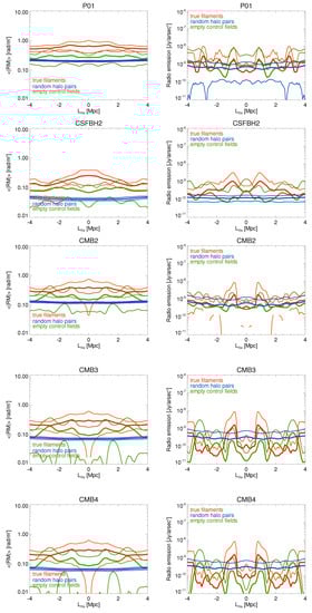 - the stacking detection of flat spectrum synchrotron emission between pairs of halos by [70] is only apparently consistent with all models. However, in that work, the detailed analysis of these simulations also showed that the DYN5 and CSFBH2 models are incapable of producing enough radio emission compatible with the observed extend of the stacking excess. In all astrophysical scenarios, some patches of high magnetic field can be found within filaments. These are typically confined to the active galaxies, from which they were released, and cannot efficiently fill the most peripheral layers of filaments, where most of the emission from the shocked gas comes from in our models.