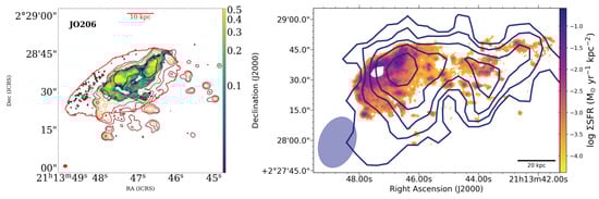 - Ramatsoku, M.; Serra, P.; Poggianti, B.M.; Moretti, A.; Gullieuszik, M.; Bettoni, D.; Deb, T.; Fritz, J.; van Gorkom, J.H.; Jaffe, Y.L.; et al. GASP–XVII. H I imaging of the jellyfish galaxy JO206: Gas stripping and enhanced star formation. Mon. Not. R. Astron. Soc. 2019, 487, 4580–4591. [Google Scholar] [CrossRef]
