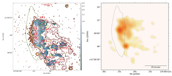 - Ignesti, A.; Vulcani, B.; Poggianti, B.M.; Paladino, R.; Shimwell, T.; Healy, J.; Gitti, M.; Bacchini, C.; Moretti, A.; Radovich, M.; et al. GASP XXXVIII: The LOFAR-MeerKAT-VLA view on the non-thermal side of a jellyfish galaxy. arXiv 2021, arXiv:2110.12719. [Google Scholar]