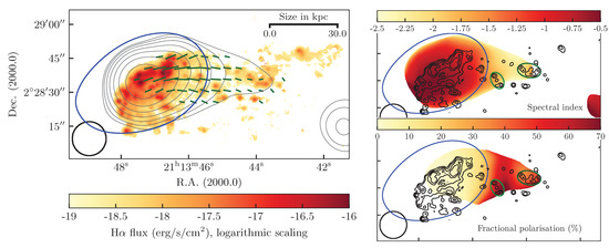 - Müller, A.; Poggianti, B.M.; Pfrommer, C.; Adebahr, B.; Serra, P.; Ignesti, A.; Sparre, M.; Gitti, M.; Dettmar, R.J.; Vulcani, B.; et al. Highly ordered magnetic fields in the tail of the jellyfish galaxy JO206. Nat. Astron. 2021, 5, 159–168. [Google Scholar] [CrossRef]