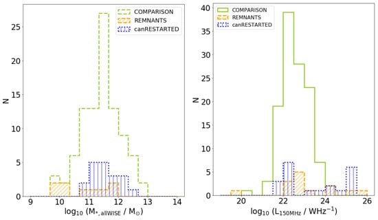 In [], based on the radio and optical properties of our sample, we conclude that there is no statistical difference in the host galaxies of our three samples of candidate remnant radio galaxies, candidate restarted radio galaxies, and the active comparison sample. Here, we reproduce the stellar mass and radio luminosity distributions of the revised samples in Figure 1. The sources in our sample have stellar masses in the range of and , consistent with massive elliptical galaxies. The high mass (M > ) tail of the distribution is likely the result of the IR emission being contaminated by AGN-heated dust and therefore stellar masses are overestimated. In the right panel of Figure 1, the majority of the radio sources in our sample (∼88%) have radio luminosities at 150 MHz ranging from ) = 21.5 to ) = 25.0.