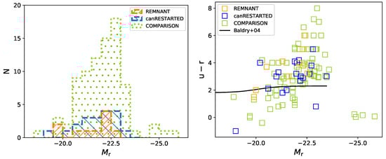 Left: Distributions of the absolute band magnitude, , for remnant (orange), candidate restarted (blue), and active radio sources (green). Right: vs. colour of the remnant (orange), candidate restarted (blue), and active sources (green). The black solid line separates the blue cloud from the red sequence, following the [] definition.