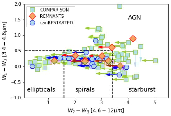The Wide-Field Infrared Survey Explorer (WISE) colour–colour diagram for the sample of remnant radio sources (orange diamonds), candidate restarted radio sources (blue hexagon), and sample of active galaxies (green squares). This figure is an adapted version from [] and follows the classification from [].