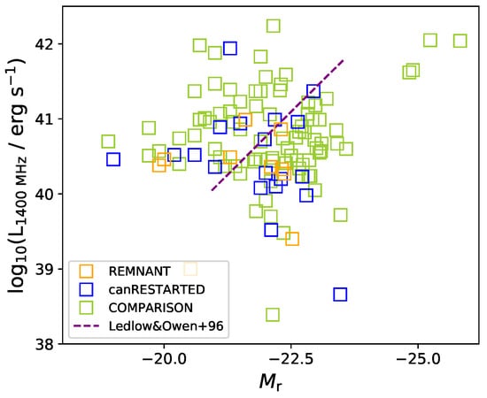 In addition to the host galaxy classification, we also want to look at the radio morphology classification, specifically the FRI and FRII dichotomy. According to [] (see Figure 7 in their paper), the leftmost box in the WISE colour–colour plot is mainly occupied by FRI radio sources, which are predominantly LERGs, while the FRIIs can be both HERGs and LERGs (e.g., []). However, the FRI and FRII radio sources studied by [] show a large degree of overlap in the WISE colour–colour plot and, therefore, no clear distinction between two groups is seen. This is in contrast with [], who concluded that FRIs and FRIIs populate well-separated regions in a plane defined by the host optical luminosity vs. their radio luminosity. However, their finding was based on flux-limited samples, with different redshift distributions and environments for FRIs and FRIIs. These selection effects have led to some uncertainty as to whether this relation can be used to interpret the full population of radio galaxies. FRI radio sources populate the region below the line defined by [], shown in Figure 4. According to this figure, sources in our sample are a mix of FRI and FRII radio sources, with no significant difference found between sub-samples. However, it is important to note that the classification of remnant and restarted radio sources is more complicated than for active radio sources, as already discussed in [,]. We discuss this in Section 7.