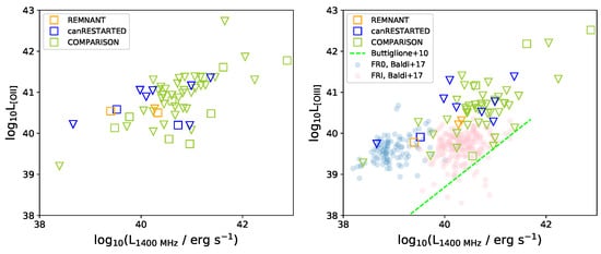 We have compared the luminosities (or limits) of the emission lines in our objects with samples available in the literature. In the right panel of Figure 5, we see that the three sub-samples share the same range of L[O iii] and radio luminosity of FRIs presented by [], and FRIs of the 3C sample indicated with a green dashed line, from []. Furthermore, some of our objects are reaching lower radio luminosities, where the correlation between the emission line and radio luminosity flattens out, as is indeed the case for the less powerful sources in our sample []. Therefore, we assume a similarity between FRIs and our samples of remnant, candidate restarted, and active radio sources in terms of AGN bolometric power and accretion rate.