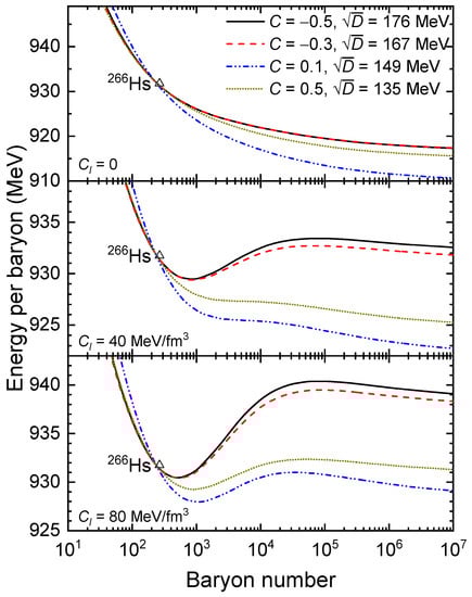 The obtained energy per baryon for QM nuggets are then presented in Figure 2, where we have adopted the parameters indicated in Table 1 as well as the smallest possible surface tension value . It is found that the energy per baryon for various cases crosses at and is generally decreasing with A. However, if large symmetry energies with and 80 MeV/fm were considered, large QM nuggets are destabilized and there may exists QM nuggets at that are more stable than others. Particularly, there are even cases where the minimum energy per baryon of QM star matter is larger than 930 MeV but that of QM nuggets smaller than 930 MeV, e.g., , MeV, and MeV/fm. Such kind of scenarios occur when the surface tension value is smaller than the critical one , which can be roughly estimated with Equation (1) with the corresponding values presented in Table 1. In such cases, the surface of an QM star will fragment into a lattice of QM nuggets immersed in a sea of electrons, similar to the cases of strange stars with crusts of strangelets [,].