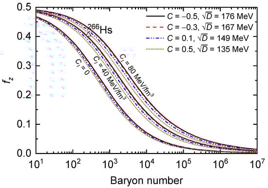 Then we can constrain the parameters by comparing the binding energy of QM nuggets with finite nuclei, where QM nuggets should always be unstable at and stable as . At this moment, the heaviest -stable nucleus is Hs with its energy per baryon being 931.74 MeV [,,]. We thus require the energy per baryon obtained with Equation (7) at should always be larger than that of Hs, where a lower limit for the surface tension value is found for various combinations of parameters. The corresponding constraints are then indicated in Figure 1 for . The red curve indicates the boundary with the minimum energy per baryon MeV, so that QM can be more stable than nuclear matter at in the lower left region. If we demand QM star matter to be more stable than neutron star matter, the stable-unstable boundary is expected to shift slightly to the lower left region. Meanwhile, the surface tension value should be larger than , which favors the upper right region at a fixed . The combination of both constraints indicate an stability window for QM at a given surface tension value . Finally, it is worth mentioning that the constraints in Figure 1 are insensitive to , where we have only presented the results at .