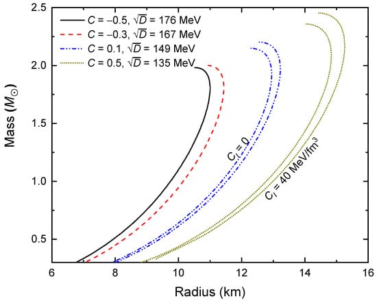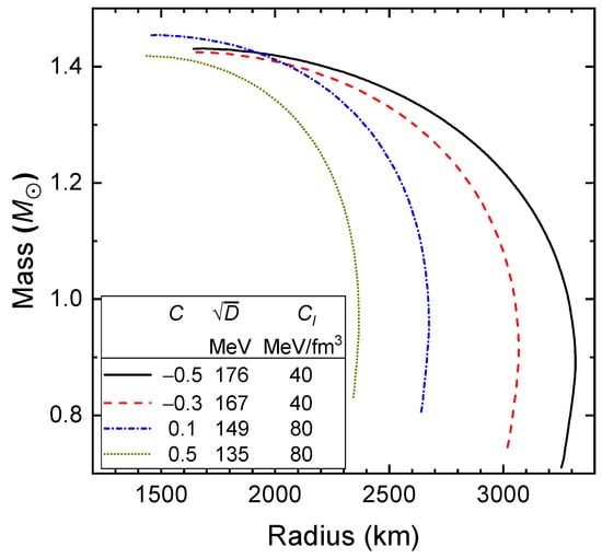 The energy per baryon of QM nuggets is decreasing monotonously with baryon number for certain choices of parameters in Figure 2, which excludes a crust of QM nuggets. The corresponding mass-radius relations of bare QM stars are then presented in Figure 4. Note that the third term in the quark mass scaling in Equation (3) generally introduces an repulsive interaction among quarks, so that larger masses and radii are obtained for larger symmetry energy (larger ). The obtained maximum masses for the parameter sets (C, in MeV): (, 176), (, 167), (0.1, 149), and (0.5, 135) reach the observational mass (, 95.4% credibility) of PSR J0740+6620 [], while the radii of the two-solar-mass stars are consistent with that of PSR J0740+6620 ( km and ) only for and MeV []. Nevertheless, if we examine the tidal deformation of those stars, only the QM stars obtained with the parameter sets (, 176) and (, 167) meet the constraints from the binary neutron star merger event GW170817 [].
