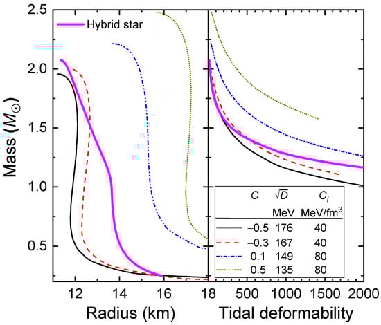Mass-radius relations (left) and tidal deformabilities (right) of QM stars with crusts, where the EOSs presented in Figure 5 were adopted. The corresponding values for typical hybrid stars from Reference [] are presented as well.