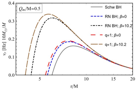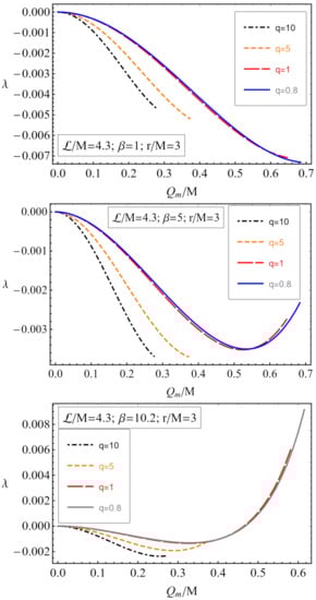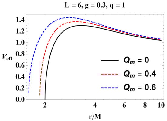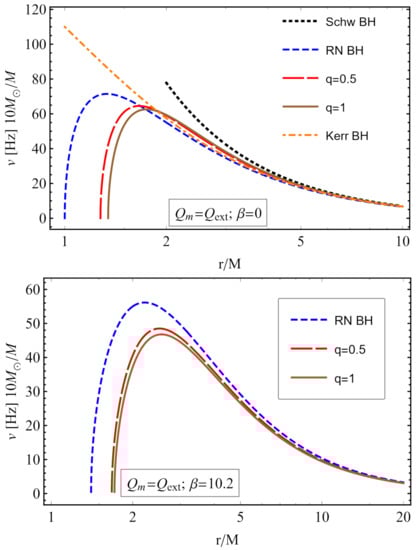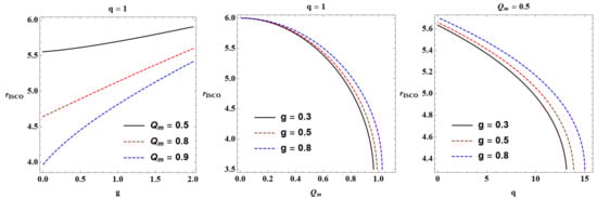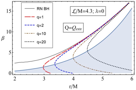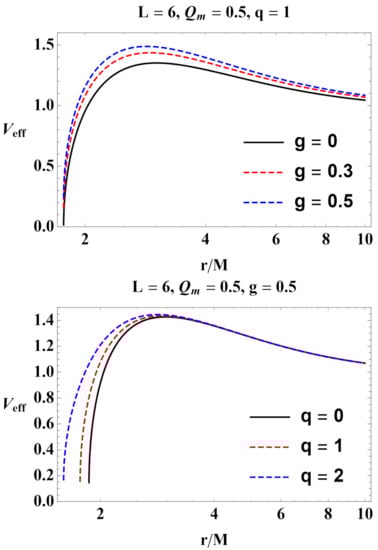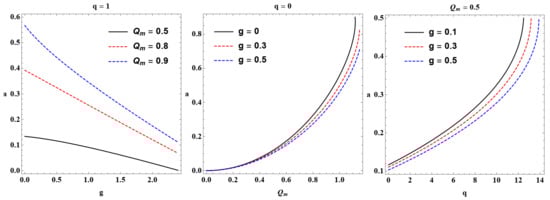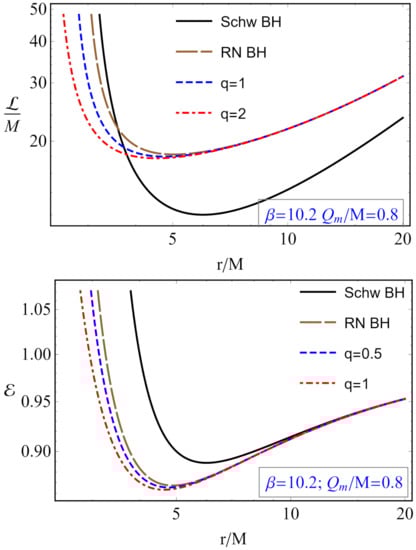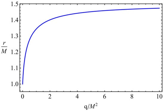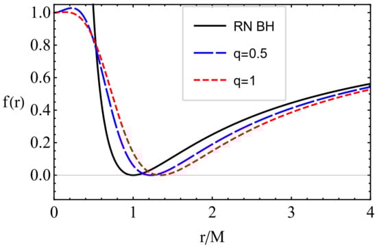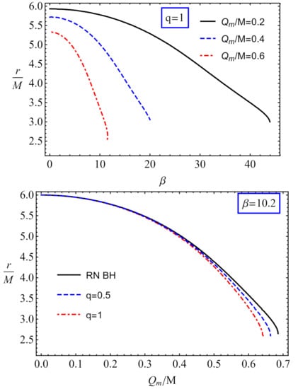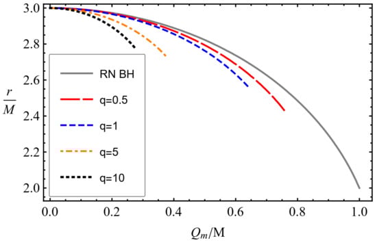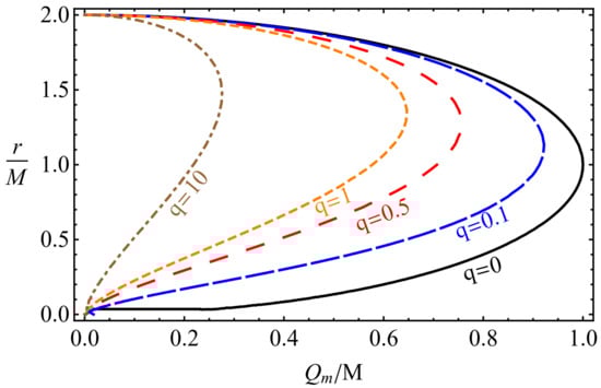 One can see the effects of the nonminimal coupling parameter, q, and the BH charge, , on the event horizon in Equation (8).