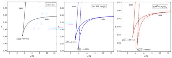 The dependence of specific angular momentum and energy of magnetized particles on the parameter at circular orbits around magnetically charged regular nonminimal BHs is plotted in Figure 4 for the different values of the nonminimal coupling parameter and fixed values of the magnetic charge of the central object. One can see from the figure that the increase in both the magnetic charge of the BH and the nonminimal coupling parameter causes a decrease in the minimum value of the angular momentum, while the energy’s minimum increases. Moreover, the energy and angular momentum exhibit minimum decreases in the presence of non-zero BH charge and the coupling parameter, as is seen in Figure 5.
