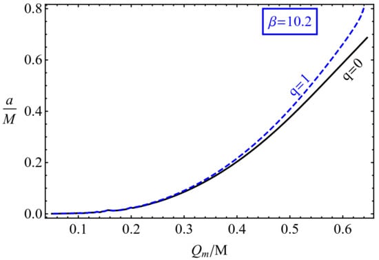 One may see the effect of the coupling parameter, q, on the extreme value of the magnetic BH and the minimal value of its outer horizon using Equations (11) and (12).