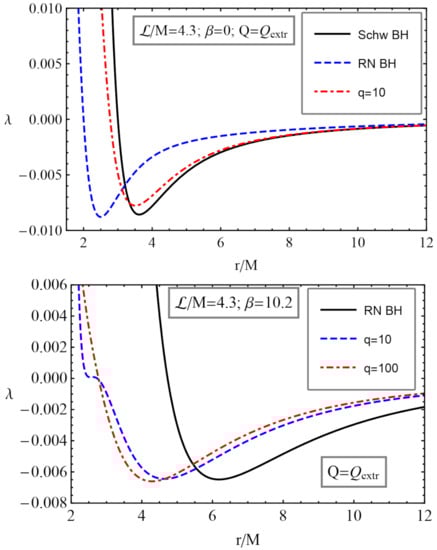 The radial dependence of the Lyapunov exponent for neutral (top panel) and magnetized particles (bottom panel) around magnetically charged BHs is presented in Figure 9. It is seen from the figure that the distance where unstable orbits become stable for neutral particles shifts towards the central BH due to the presence of the magnetic charge of the BH. Moreover, one can see that the distance is closer to the central object in the case of the RN BH than the regular magnetic BH one.