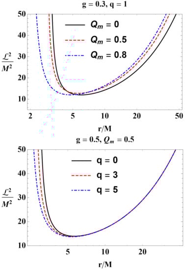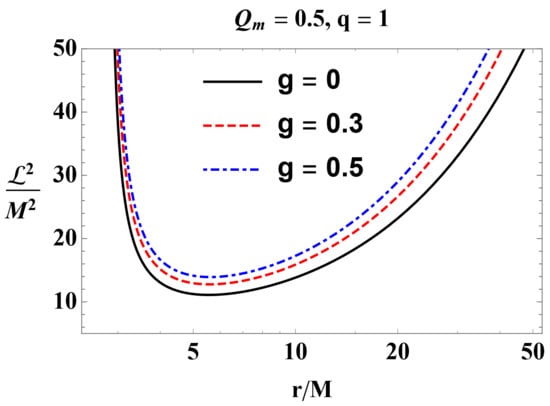 From the first equation in Equation (26), one can find the specific angular momentum and energy of the magnetized particle for circular orbits in the following form: